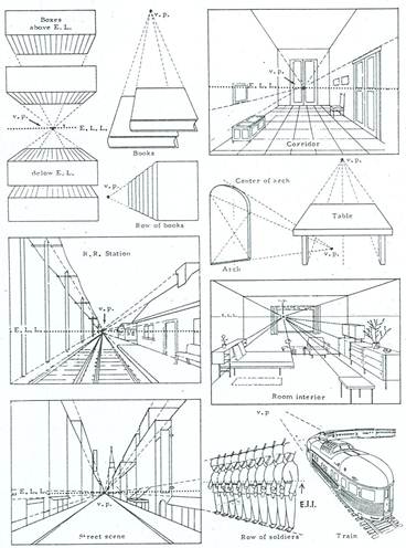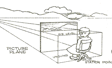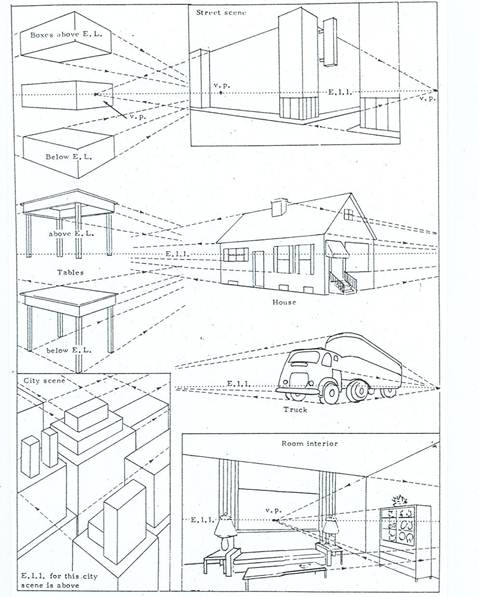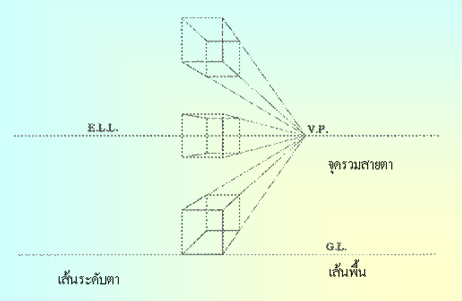 1. เส้น ระดับตา (EYE LEVEL LINE ,E.L.L.) เป็นเส้นแนวนอนในระดับเดียวกับตาของผู้วาด หรือเส้นขอบฟ้า(HORIZONTAL LINE,H.L.) เป็นเส้นนอนแนวราบซึ่งแบ่งพื้นที่ระหว่างพื้นดินหรือ