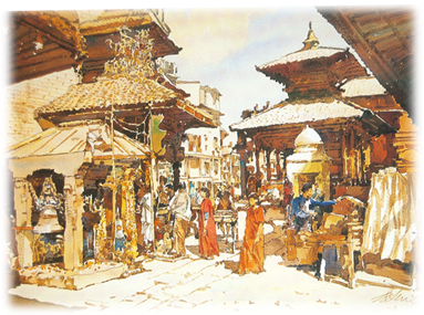 ภาพวาดสีน้ำแสดงการวาดโดยใช้ทัศนียภาพแบบจุดรวมสายตาสองจุด