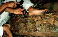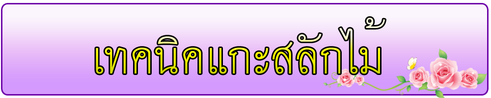 7. แกะตัวลายหรือโกลนลายด้วยการใช้สิ่วฉากปาดตัวลายโดยให้ตั้งฉากด้านหนึ่ง เอียงด้านหนึ่ง เป็นการคัดลายให้เห็น