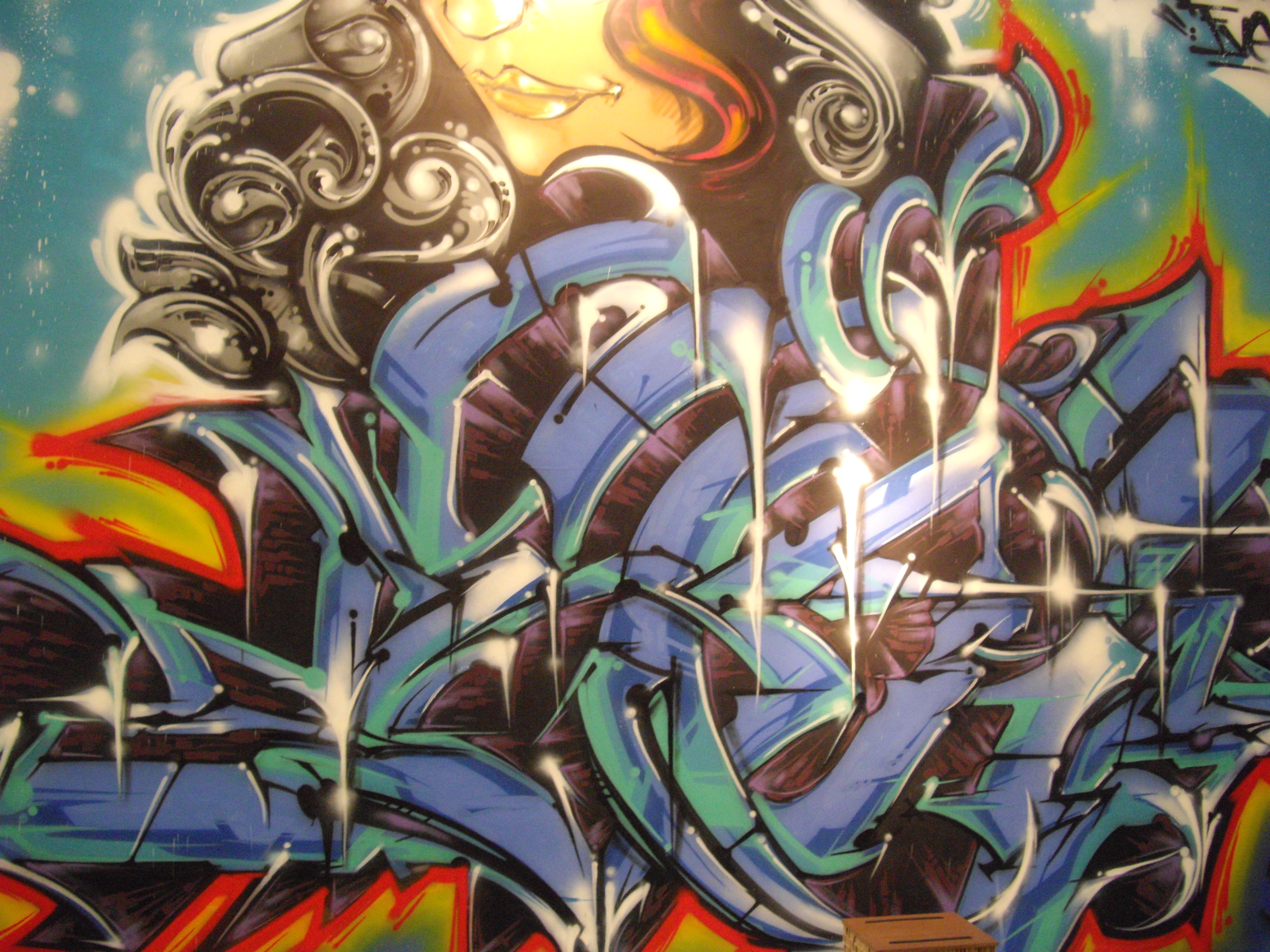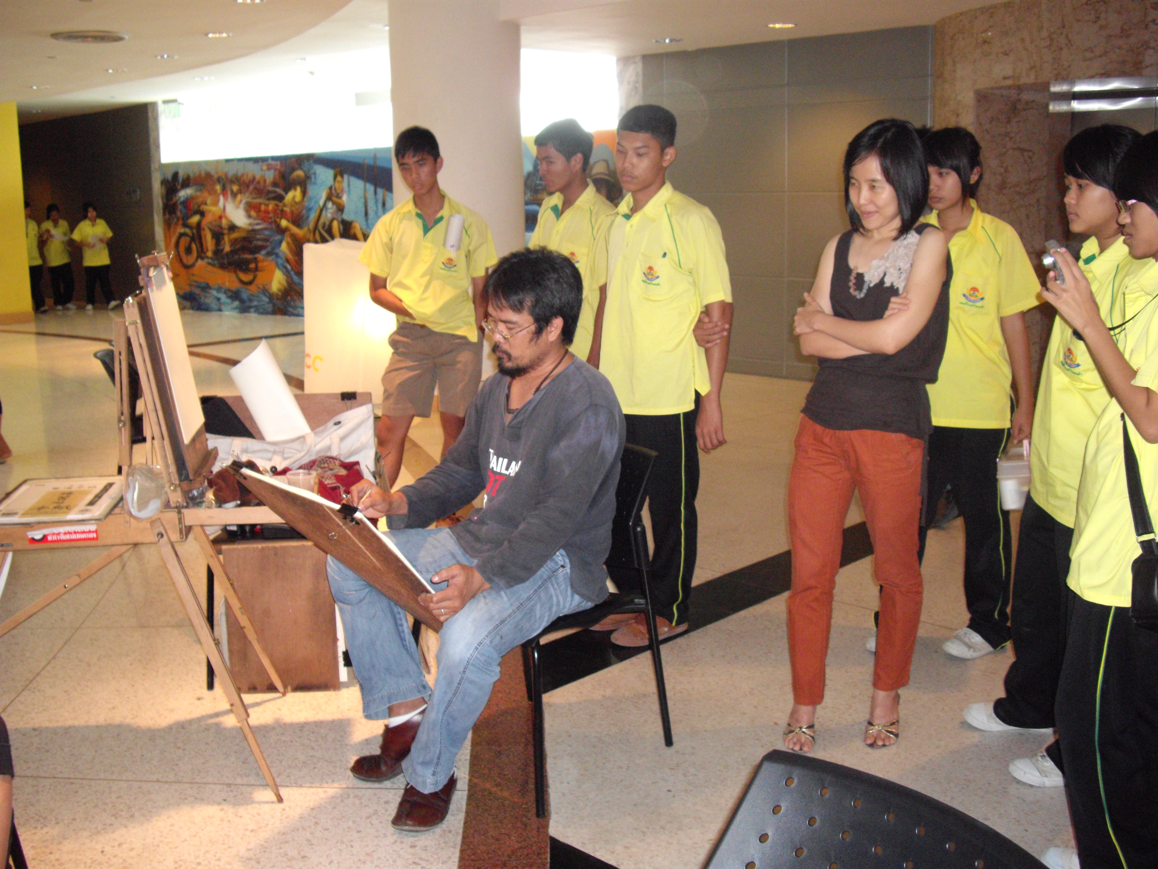 ศิลปินกำลังเขียนภาพโดยใช้สื่อวัสดุอุปกรณ์ ให้ผู้ชมได้วิเคราะห์วิจารณ์