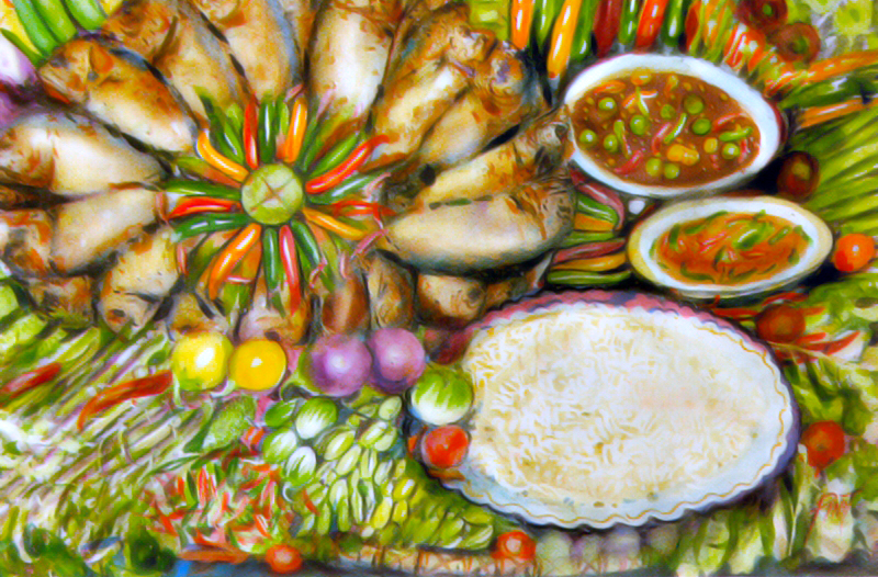 เป็นภาพแสดงการถ่ายทอดรูปแบบเหมือนจริง (Realistic) การจัดองค์ ประกอบของรูปร่าง วงกลม และทิศทางแนวเส้นของรูปได้อย่างกลมกลืน ลดหลั่นเป็นจังหวะต่อเนื่อง ใช้น้ำหนักสีและขนาดที่แตกต่างกันของภาพทำให้มีจุดเด่นปลาทู และจานชามไม่กลืนหายลงไปกับผักที่เป็นพื้นรองรับ