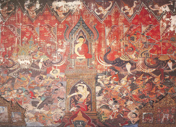 ภาพจิตรกรรมฝาผนัง วัดดุสิดาราม กรุงเทพฯ เป็นฝีมือช่างในสมัยรัชกาลที่ 1 ชื่อภาพ "มารผจญ" เป็นภาพพระโพธิสัตว์ปิดทอง