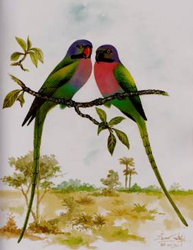 ชื่อภาพ “นกแขกเต้า” เทคนิค สีน้ำของปัญจพร ศรีคุณ เป็นภาพในรูปแบบเหมือนจริงทั้งด้านสัดส่วน สีสัน แสงเงา และระยะของภาพ จะเห็นได้ว่าตัวนกและกิ่งไม้จะใช้สีที่สดใส และเน้นแสงเงาอย่างเข้มข้นในขณะที่ภาพทิวทัศน์ที่ไกลออกไปจะใช้สีหม่นและบางเบา