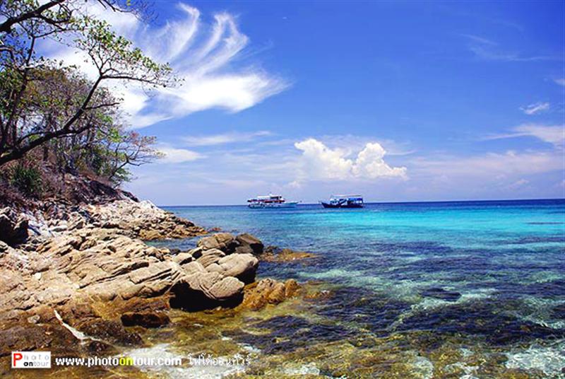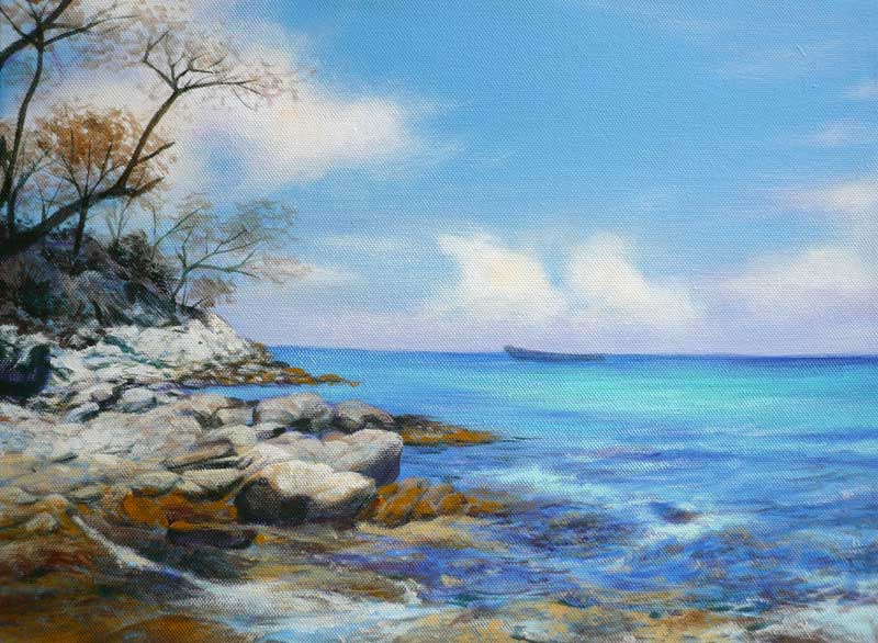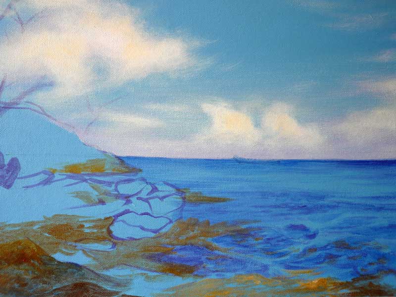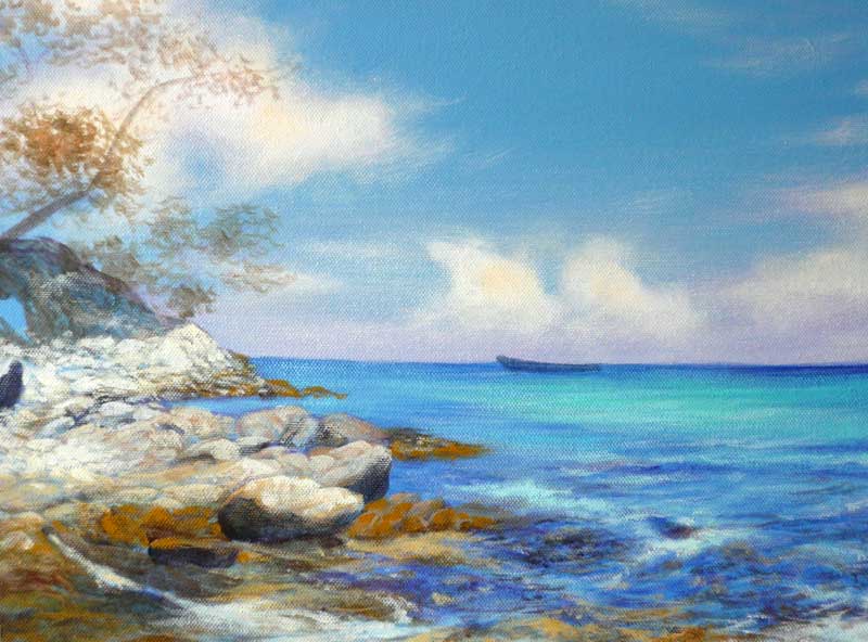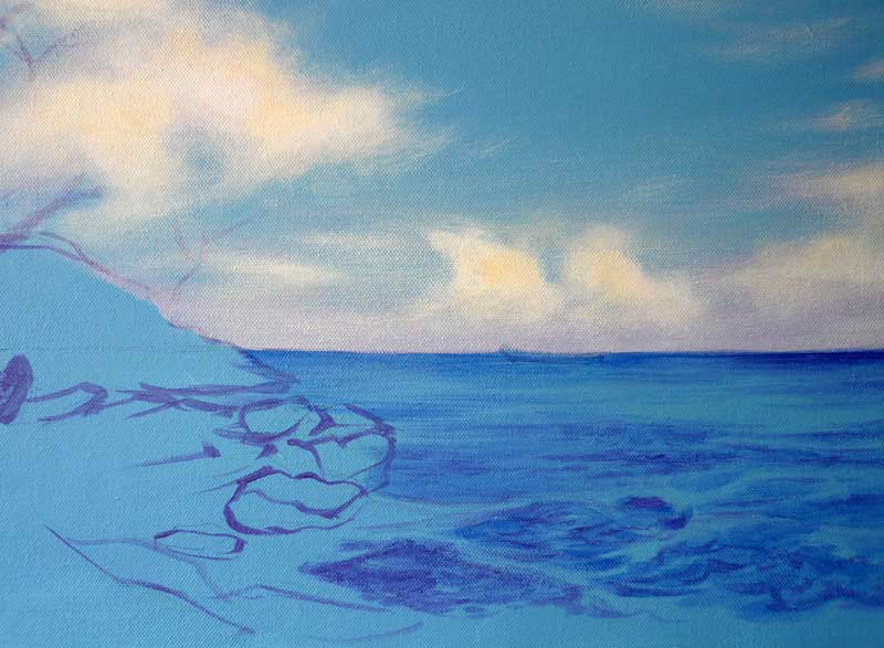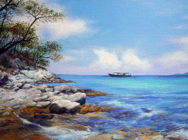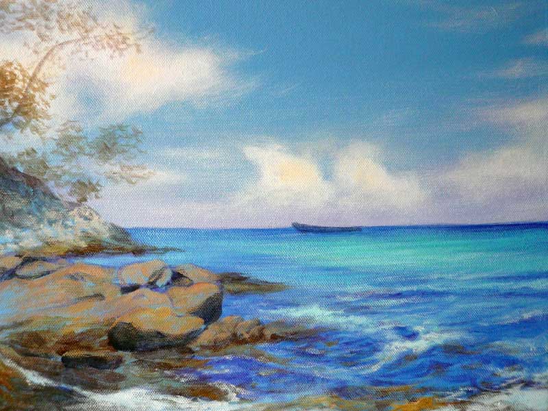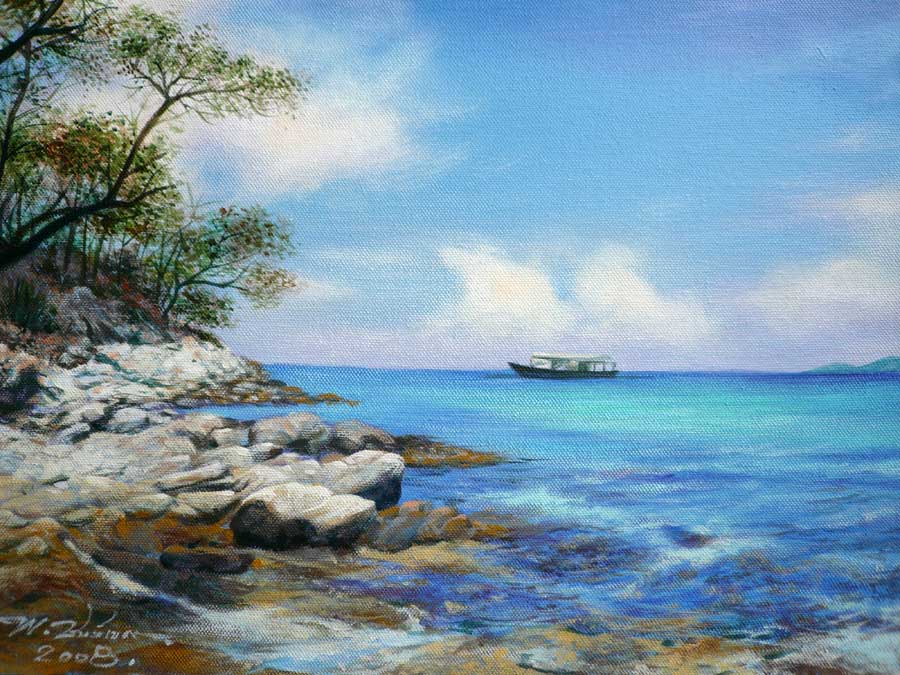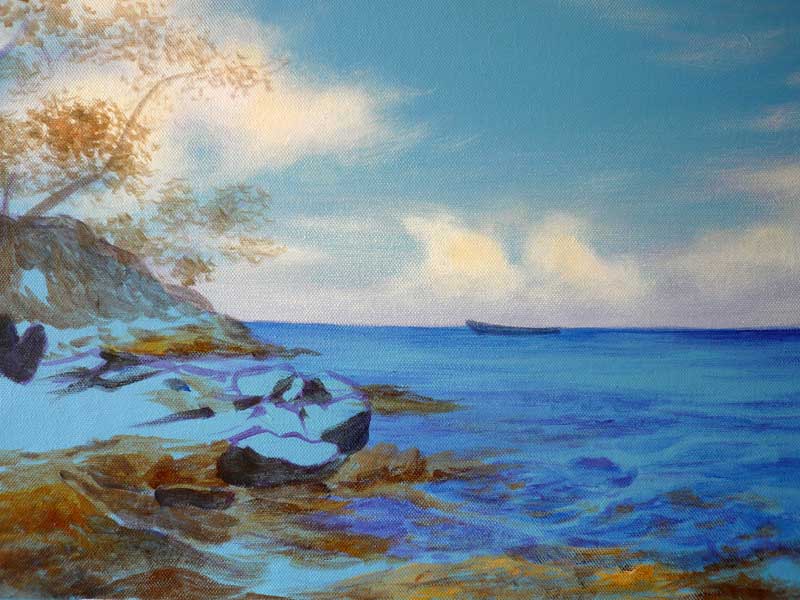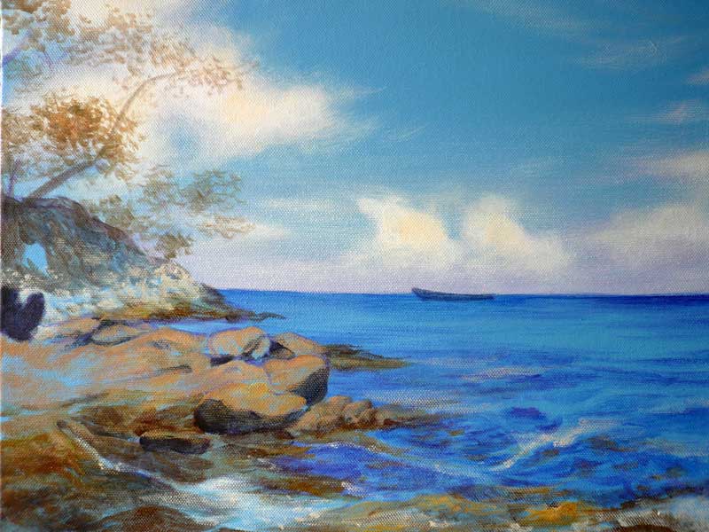 9.ราย ละเอียดต่อไปครับ เพิ่มน้ำหนักเข้มในน้ำทะเลบ้างครับ โดยใช้น้ำเงิน+น้ำตาล ผสมน้ำจางๆ ตามด้วยโขดหินที่ใช้yellow ocher+burnt sienna แต่เนื้อสีข้นหน่อย แตะ เป็นบางส่วน ที่เห็นว่าโทนสีอาจจะยังไม่ได้อย่างที่ต้องการ (มาถึงตรงนี้ไม่ได้หมาย ความว่าทุกคนจะต้องทำตามผมทุกขั้นตอนนะครับ บางคนอาจจะลงสีตรงโขดหินได้สี อย่างที่ต้องการแล้ว ตรงนี้และครับที่มันไม่ใช่สูตรตายตัว แต่ละคนต้องดูภาพรวมและ ความต้องการของแต่ละคน แล้วแก้ไขไปตามสมควรครับ) แล้ว นำไปผสมสีขาว เพื่อลงในส่วนของน้ำบางจุดครับ แล้วก็เอาสีนี้แหละครับไปแต้ม ตามโขดหินระยะหน้าให้เกิดความสว่างขึ้น รอให้แห้งซักพัก จังหวะที่รอ ใช้สีขาวแตะ ฟ้าเทานิดๆ เน้นส่วนสว่างที่สุดของก้อนหินครับ สังเกตลักษณะของก้อนหินนะครับ ไม่ได้มีขนาดเท่าๆกันทุกก้อน มีใหญ่บ้างเล็กบ้าง ซ้อนกันบ้าง