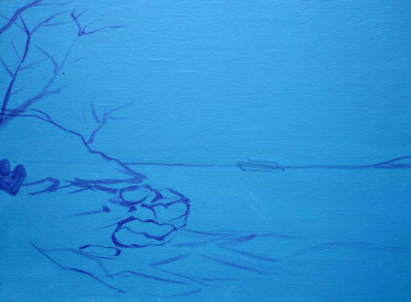 12.เก็บ รายละเอียดที่เรือครับ ใช้น้ำเงินเข้มๆ เขียนรายละเอียดลงไป ตามด้วยรายละเอียด เล็กๆน้อยๆ โทนฟ้าอ่อน เน้นในส่วนที่เข้มอีกทีในภาพครับ เช่นกิ่งไม้อาจจะเพิ่มความ เข้มอีกรอบครับ ตอนนี้ใกล้เสร็จแล้วครับ ผมถอยมาดูภาพรวมอีกทีรู้สึกว่าท้องฟ้าด้าน บนสุดน่าจะมีน้ำหนักเข้มไล่มาซัก เล็กน้อย ก็เลยเพิ่มเข้าไป ทำให้มีสีที่พึ่งเพิ่ม ไปทับ ในก้อนเมฆด้านซ้าย ก็เลยจัดการวาดเมฆด้านซ้ายซ้ำอีกรอบครับ และอีกที่ที่ผมยังไม่ พอใจคือส่วนของโขดหินสีน้ำตาล ผมใส่เหลืองมากไปหน่อยเลยเอา ฟ้าม่วง น้ำหนัก กลางๆมาปัดให้สีไม่โดดเกินไป