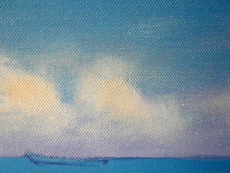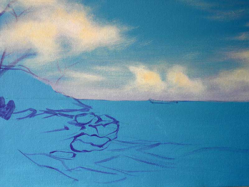 3.ขั้น ต่อไป ภาพทิวทัศน์นิยมวาดจากข้างหลังมาข้างหน้า แต่ใครจะเริ่มจากข้างหน้าก่อน ก็ได้ครับ ไม่ผิดกติกา ผมใช้ultramarine+violet+titanium white แต่ใช้ขาวให้มากขึ้น เพื่อทำเป็นเมฆครับ ทีนี้สีฟ้าที่เป็นพื้นมันดันแห้งแล้ว จะทำไงถึงจะเกลี่ยสีได้ หากเป็น สีน้ำมันขั้นตอนนี้จะเกลี่ยให้นุ่มและกลมกลืนได้ง่ายมาก