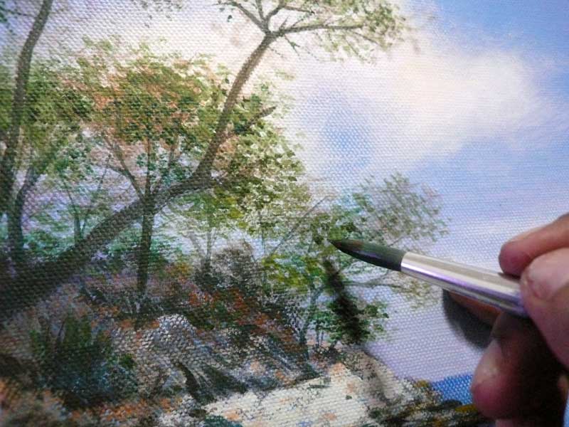 8.เริ่ม เก็บรายละเอียดครับ อาจจะเกิดคำถามว่าทำไมไม่เขียนทีเดียวเป็นจุด ให้เสร็จไป เลย สำหรับคนที่ชำนาญสามารถทำได้ครับ แต่ถ้ามือใหม่จะกำหนดน้ำหนักไม่ได้ ไหน จะเรื่องของสีที่เรายังกังวลมันอยู่ ถ้าเราไม่เห็นโครงสีโดยรวม เราอาจต้องเสียเวลาแก้ งานตรงโน้นที ตรงนั้นทีไม่มีจบครับ ผมเริ่มเก็บรายละเอียดที่ทะเล โดยตอนนี้เรายังขาดสีเขียวอยู่ ใช้สีเขียว veridian+ขาว (หลังจากนี้ไปผมจะใช้สีที่ค่อนข้างจะข้นตลอดจนเสร็จทั้งภาพนะครับ จะมีบาง ส่วนที่ใช้สีบางๆบ้าง จะบอกเป็นจุดๆไปครับ) ทาแล้วปัดแห้งลงไปครับ ไล่ลงมาด้าน ล่างเรื่อยๆ พอมาถึงตรงฟองคลื่น หรือโทนสว่างก็ใช้สีฟ้า+ขาว แล้วปัดเช่นเคย ดูแบบ และหรี่ตามองแสงเช็คน้ำหนักเช่นเคย