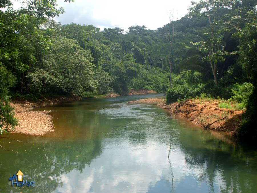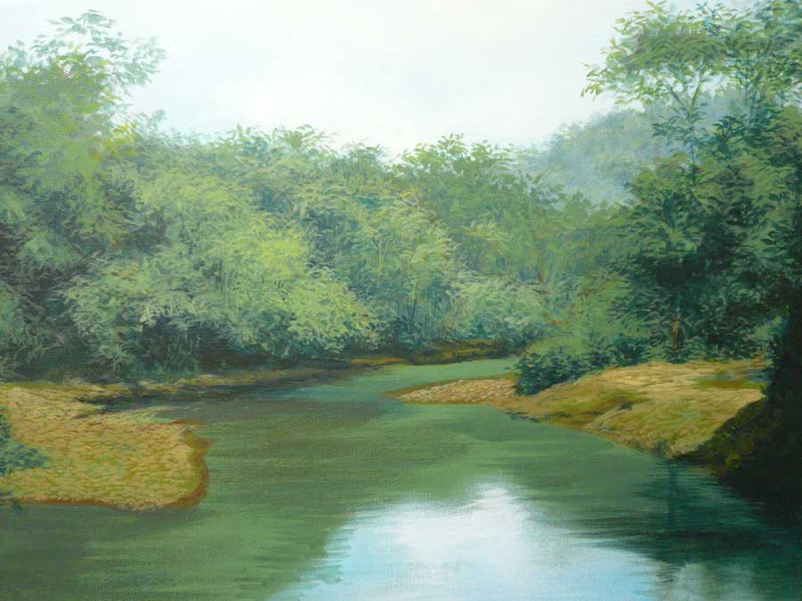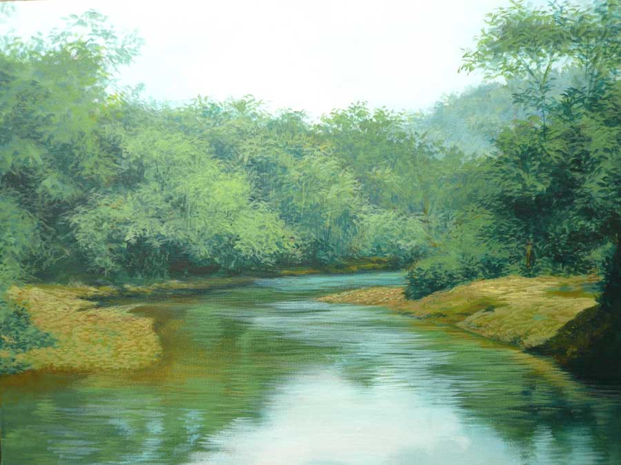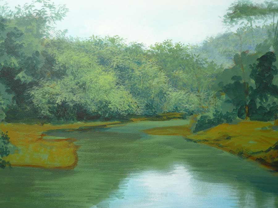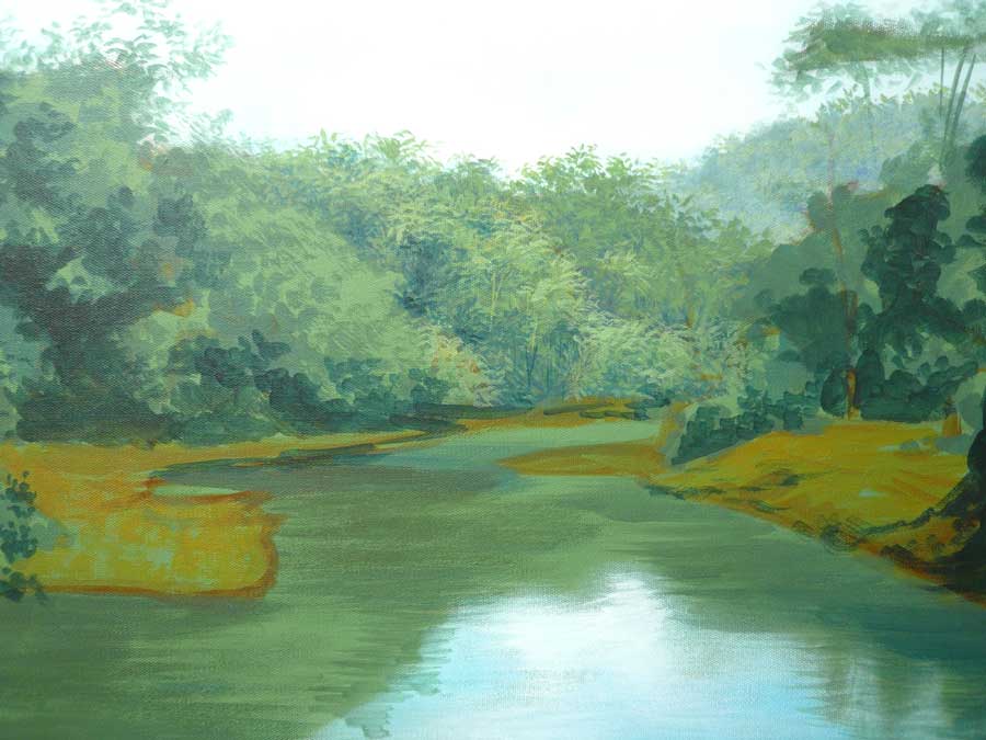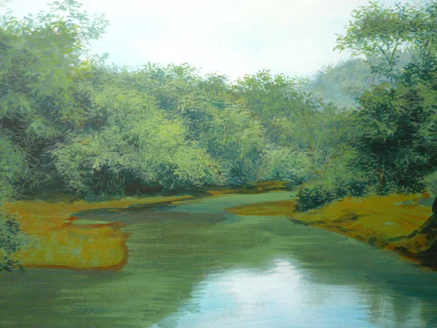 การวาดรูปสีอะครีลิคทิวทัศน์ต้นไม้ และลำธาร