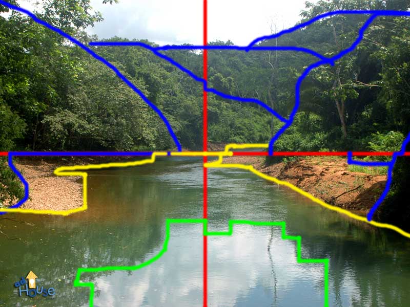 2.ผมแบ่งภาพเป็น 4 ส่วนก่อน(สีแดง) พอได้ตรงนี้แล้วมองกลุ่มของต้นไม้ แบ่งเป็นกลุ่ม ใหญ่ๆ ร่างขึ้นมาโดยไม่ต้องไปสนใจรายละเอียด อันนี้เป็นหลักสำคัญในการร่างรูปเลยนะ ครับ ฝึกให้ติดเป็นนิสัย แล้วจะทำให้ทำงานได้ง่ายขึ้น ตามด้วยส่วนต่างๆจนครบครับ ใส่ใจในการร่างภาพก็จะออกมาสวย โดยเฉพาะตรงเส้นสีเหลือง ลำธารของเราจะดูดีหรือ แปลกก็ตรงนี้ จากนั้นจะเพิ่มรายละเอียดรอบสอง ให้เห็นมากขึ้นก็ได้ครับ อันนี้แล้วแต่นะ ครับถ้ากลัวพลาดตอนลงสี ก็ร่างให้ละเอียดหน่อย จากนั้นตัดเส้นด้วยสีครับ เวลาลงสีชั้น ต่อไปเราจะได้เห็นเส้นร่าง