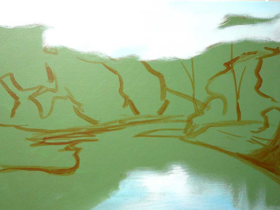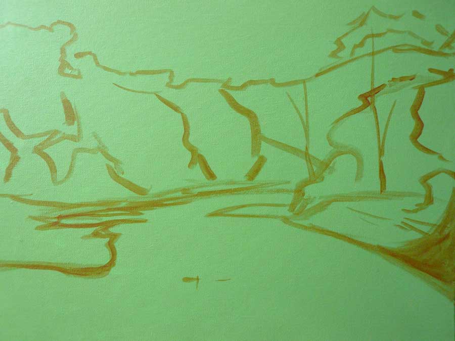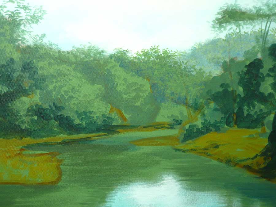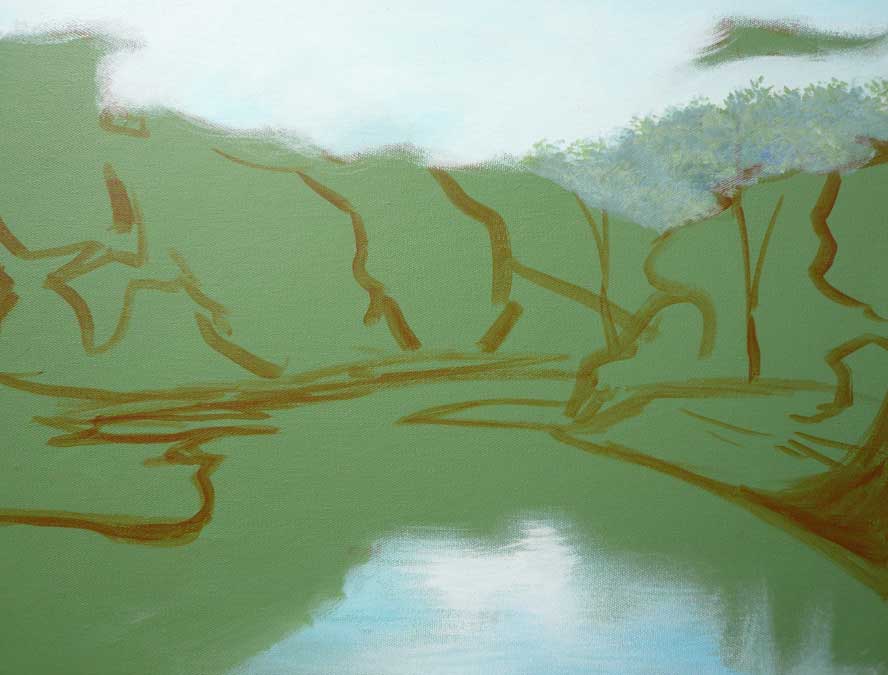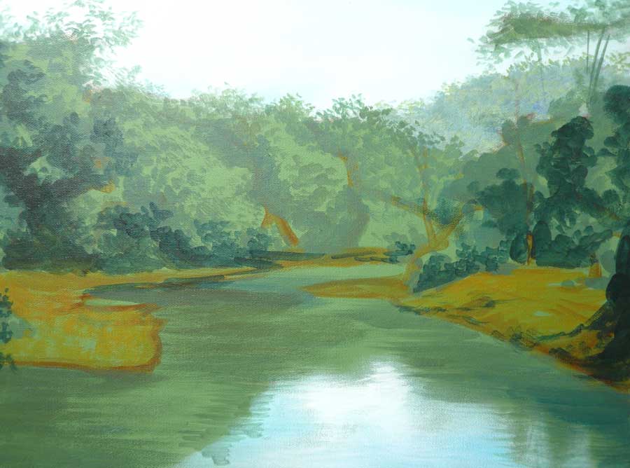 13.ใช้ Yellow ochre +ขาว แตะแสงในส่วนของพื้นดินทั้งซ้ายและขวา เหล่านี้เป็นการจับ ลักษณะเท่านั้น ไม่ต้องเหมือนซะทั้งหมดก็ได้ จะเห็นว่าการที่เรารองพื้นตอนแรกด้วยสี เขียวทั้งภาพ จะเป็นการคลุมโทนให้สีไม่โดด