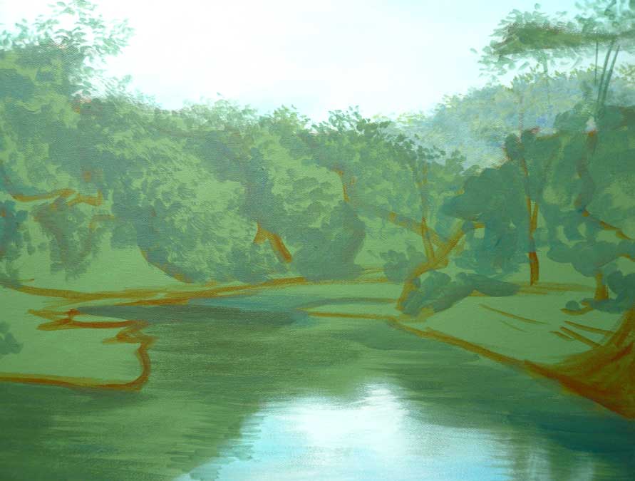 8.เพิ่ม น้ำหนักของสีเขียวให้เข้มขึ้นอีกครับ ลงที่กลุ่มด้านหน้าครับ โดยเอาเขียวเดิม มา ผสมน้ำเงินและน้ำตาล ตามด้วย Yellow ochre +Burnt sienna รองพื้นในส่วนพื้นดินครับ พอถึงตรงนี้ ก็รองพื้นเสร็จรอบแรกครับ จะเห็นภาพรวมของสี น้ำหนัก และระยะ พร้อมที่ จะแก้ไขและเพิ่มเติม