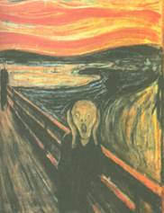 กรีดร้อง (THE SCREAM) ที่มา : หอสมุดแห่งชาติ เป็นภาพที่ใช้แนวเส้นเฉียงของสะพาน ทำให้เกิดมิติลวงตาดูมีระยะลึกเข้าและใช้แนวเส้นของสีมาประยุกต์ใช้สื่อความหมายของเรื่องราว สะท้อนให้เห็นภาพคนซึ่งอยู่ในภาวะแห่งความหวาดกลัว อันเนื่องมาจากความทุกข์ยากของภาวะสงคราม เขากรีดร้องขอความช่วยเหลือด้วยความหวาดระแวง เพราะคิดว่าสองคนเดินตามหลังมาเป็นคนร้าย