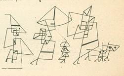 เทคนิควาดเส้น ผลงานของ พอล คลี (PAUL KLEE) ที่มา : หอสมุดแห่งชาติ เป็นภาพที่ใช้แนวเส้นเฉียงหรือเส้นทแยงมาใช้ให้เกิดจังหวะการเคลื่อนไหว และใช้เส้นต่างๆ มาจัดให้ประสานกลมกลืนสอดคล้องกับอารมณ์ความรู้สึกของภาพ สื่อให้เห็นถึงความรักความสัมพันธ์ในครอบครัว ซึ่งประกอบไปด้วย พ่อ แม่ ลูก และสุนัข