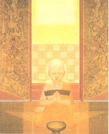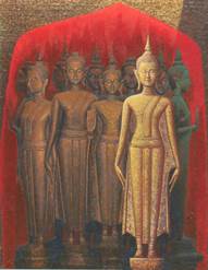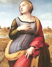 ![]() เซนต์แคเทอรีนแห่งอเล็กซานเดรีย (ST.CATHERINE OF ALEXANDRIA) ที่มา : หอสมุดแห่งชาติ เป็นภาพที่นำน้ำหนักอ่อนแก่ของสีมาใช้แสดงมิติของผ้า ส่วนใบหน้าและมือให้เด่นขึ้นมาจากฉากหลังซึ่งเป็น ทิวทัศน์