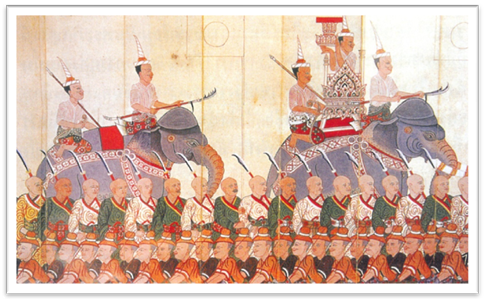 ภาพจิตรกรรมในสมุดข่อยเรื่อง "สมุดภาพกระบวนพยุหยาตรา ทางสถลมาศ