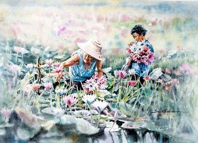 เปียกบนเปียก การระบายสีแบบเปียกบนเปียก หมายถึง การระบายน้ำลงบนกระดาษก่อนแล้วจึงระบายสีตามที่ต้องการลงไป การระบายแบบเปียกบนเปียกนี้ จะช่วยให้ท่านระบายสีติดบนกระดาษทุกส่วน เพราะกระดาษบางชนิดระบายสีติดยาก เนื่องจากมีความมันหรือความหยาบขรุขระ การระบายแบบเปียกบนเปียก มีประโยชน์มากเมื่อจะระบายท้องฟ้า หรือผิววัตถุที่มีมัน เพราะจะให้ความรู้สึกกลมกลืนของสีเด่นชัด เทคนิคของการระบายแบบเปียกบนเปียกที่สำคัญมี 2 ประการ คือ