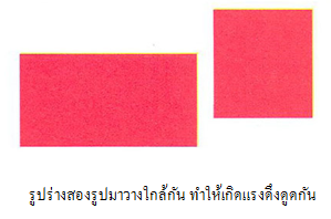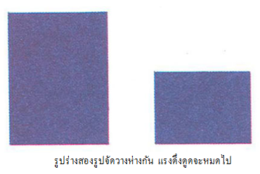 2. รูปร่างสองรูปจัดวางห่างกัน แรงดึงดูดจะหมดไป ความรู้สึกที่จะนำมารวมเป็นหน่วยเดียวกันจะไม่มี แต่จะมีความรู้สึกแบ่งแยกรูปร่าง รูปทรงสองรูปออกจากกัน ทำให้ขาดเอกภาพ
