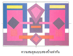 2. ดุลยภาพ (Balance) หรือ ความสมดุล หมายถึง การนำทัศนธาตุต่างๆ ทางศิลปะ เช่น จุด เส้น รูปร่าง รูปทรง 2.1.ความสมดุลแบบสองข้างเท่ากัน (Symmetrical Balance) คือ การนำทัศนธาตุทางศิลปะมาจัดองค์ประกอบศิลป์ ให้น้ำหนักทั้งสองข้างเท่ากันหรือเหมือนกันซึ่งส่วนมากจะปรากฏในผลงานจิตรกรรมไทย ประติมากรรมไทย สถาปัตยกรรมไทย และงานศิลปะสมัยใหม่ที่ต้องการให้ดูแล้วรู้สึกสงบนิ่ง มั่นคง และเลื่อมใสศรัทธา