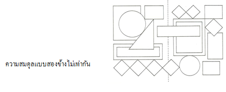 2.2.ความสมดุลแบบสองข้างไม่เท่ากัน (Asymmetrical Balance) คือ การนำทัศนธาตุทางศิลปะมาจัดองค์ประกอบศิลป์ จัดวางที่ไม่เท่ากันหรือไม่เหมือนกันทั้งสองข้าง แต่มองดูแล้วให้ความรู้สึกว่าเท่ากันจากน้ำหนักโดยส่วนรวม ความสมดุลในลักษณะนี้นิยมใช้กันอย่างกว้างขวาง เพราะสามารถให้อารมณ์ ความรู้สึกเคลื่อนไหว และให้คุณค่าทางความคิดสร้างสรรค์ที่เป็นอิสระแปลกใหม่