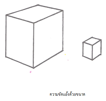 3.ความขัดแย้งด้วยขนาด เป็นการใช้ขนาดของรูปร่างรูปทรงที่มีขนาดใหญ่และขนาดเล็กแตกต่างกัน จะทำให้เกิดความขัดแย้ง การแก้ไขจะต้องแก้ด้วยการเพิ่มขนาดให้ใกล้เคียงกัน