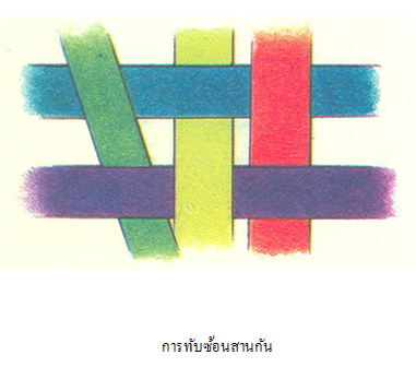 4. การทับซ้อนรูปโซ่ เป็นการนำรูปร่าง รูปทรง มาวางคล้องเกี่ยวกันเป็นลูกโซ่ 5.การทับซ้อนสานกัน เป็นการนำรูปร่าง รูปทรงมาวางไขว้กันแบบสาน