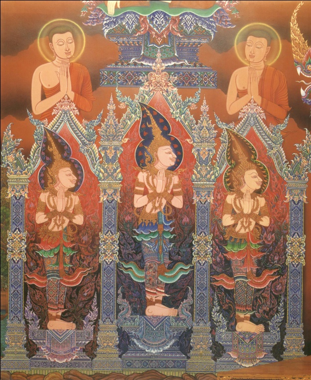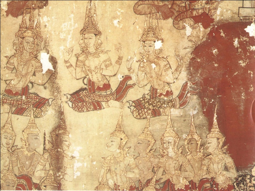 2. ศิลปะสุโขทัย (ประมาณ พ.ศ.1800 – 1918) 2.1 งานจิตรกรรม เป็นภาพจิตรกรรมฝาผนังที่เน้นหนักไปทางลายเส้นและสีเอกรงค์