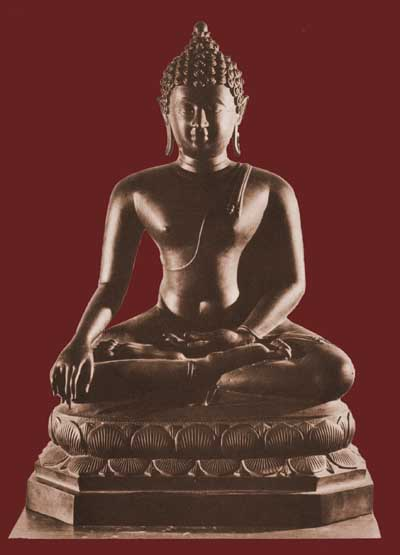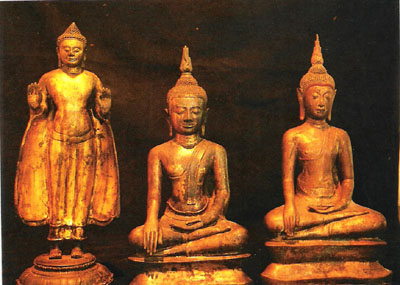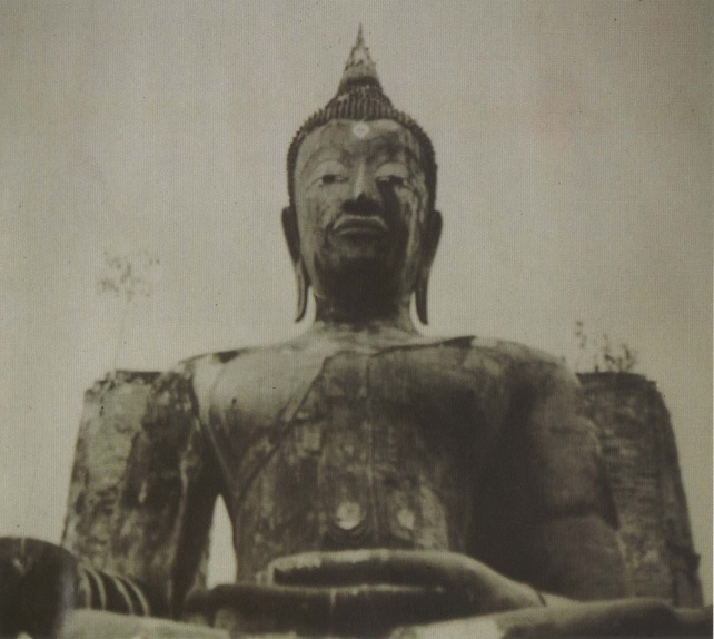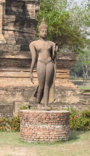 ที่มีการใช้สีเอกรงค์ (กรมศิลปากรคัดลอกไว้) 2.2 งานประติมากรรม พระพุทธรูปแบบสุโขทัย มีลักษณะงดงามอ่อนช้อยคล้ายสุภาพสตรี พระพักตร์เป็นรูปไข่ รัศมีเป็นรูปเปลวเพลิง ขมวดพระเกศาเล็ก พระขนงโก่ง พระนาสิกงุ้ม พระโอษฐ์เล็ก พระวรกายสะโอดสะอง นิ้วพระหัตถ์เรียวสลวย ขัดสมาธิราบ คุณลักษณะโดยรวมของพระพุทธรูปสุโขทัยเปี่ยมล้นด้วยพระเมตตากรุณา นิยมสร้างในพระอิริยาบถ 4 ลักษณะ คือ นั่ง นอน ยืน และเดิน โดยเฉพาะท่าเดินหรือพระพุทธรูปปางลีลามีลักษณะที่งดงามยิ่ง พระพุทธรูปสมัยสุโขทัยได้ชื่อว่าเป็นศิลปะที่มี ความเจริญสูงสุด (Classic) กล่าวคือ มีความงดงามเป็นเลิศ และมีรูปแบบที่เป็นเอกลักษณ์เฉพาะตน