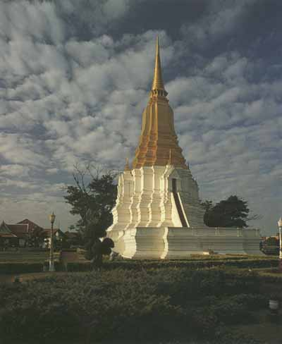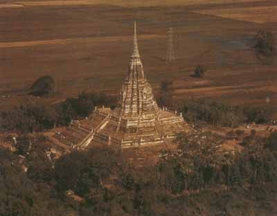 สถูปทรงพุ่มข้าวบิณฑ์ วัดมหาธาตุ จังหวัดสุโขทัย 3. ศิลปะอยุธยา (พ.ศ.1893 – 2310) เมื่อกรุงสุโขทัยเสื่อมอำนาจลง พระเจ้าอู่ทองได้รวบรวมหัวเมืองฝ่ายใต้ อาณาเขตทวารวดีเดิมไว้ในอำนาจ แล้วสร้างราชธานีขึ้นใหม่ขนานนามว่า “กรุงเทพทวารวดีศรีอยุธยา” แล้วราชาภิเษกพระองค์เองขึ้นเป็นกษัตริย์ทรงพระนามว่า “สมเด็จพระรามาธิบดีที่ 1” กรุงศรีอยุธยาเป็นราชธานีมีอายุยืนยาวถึง 417 ปี มีพระมหากษัตริย์ครองราชย์ถึง 5 ราชวงศ์ รวม 33 พระองค์ ทำให้กรุงศรีอยุธยามีความเจริญรุ่งเรืองในทุก ๆ ด้าน โดยเฉพาะด้านศิลปกรรม รูปแบบศิลปะอยุธยาได้รับอิทธิพลรูปแบบจากศิลปะลพบุรี ศิลปะสุโขทัย ศิลปะตะวันตก ศิลปะจีนและแบบอยุธยาแท้1.1 ศิลปะอยุธยาอิทธิพลศิลปะลพบุรี งานประติมากรรม ได้แก่ พระพุทธรูปแบบ “อู่ทอง” เป็นการผสมผสานกันระหว่างศิลปะแบบลพบุรี และทวาราวดี ซึ่งเป็นยุคก่อนประวัติศาสตร์ไทย ลักษณะของพระพุทธรูปมีสมาธิสงบนิ่งมั่นคง พระวรกายมีส่วนโค้ง กลมกลืนกันมากขึ้น ช่วยลดความกระด้างจากต้นแบบเดิม คือศิลปะลพบุรีหรือขอม