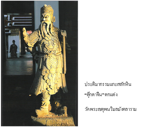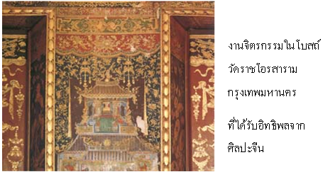 4.2 ศิลปะรัตนโกสินทร์อิทธิพลศิลปะจีน ในสมัยรัตนโกสินทร์ ไทยมีการติดต่อค้าขายกับประเทศจีนมากขึ้น การสร้างสรรค์งานศิลปกรรมจึงได้รับอิทธิพลจากศิลปะจีนทั้งทางตรงและทางอ้อม ดังนี้