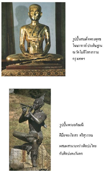 งานประติมากรรม คตินิยมดั้งเดิมของไทย ในการสร้างสรรค์งานประติมากรรมไม่นิยมสร้างรูปคนเหมือนเป็นรูปเคารพ แต่เมื่อสมัยรัตนโกสินทร์ ไทยต้องติดต่อสร้างสัมพันธ์ไมตรีและค้าขายกับประเทศตะวันตก เช่น เป็นต้น จึงได้รับวิทยาการสมัยใหม่โดยเฉพาะคตินิยมในการปั้น แกะสลัก ภาพคนเหมือน ที่มีสัดส่วนและกล้ามเนื้อเหมือนจริง โดยมีรูปแบบงานประติมากรรม 2 ลักษณะ ได้แก่ ลักษณะผสมผสานระหว่างศิลปะไทยกับศิลปะตะวันตก และลักษณะเป็นศิลปะตะวันตกล้วน หรือที่เรียกว่า “ศิลปะสากล” งานประติมากรรมที่ผสมผสานระหว่างศิลปะไทยกับศิลปะตะวันตก ได้แก่ รูปปั้นสมเด็จพระพุทธโฆษาจารย์ ขนาดเท่าคนจริง ซึ่งรัชกาลที่ 3 ทรงพระกรุณาโปรดเกล้าฯให้หล่อรูปท่านไว้สักการะบูชา ประดิษฐานอยู่ ณ วัดโมลีโลกยาราม กรุงเทพมหานคร ซึ่งมีรูปแบบคล้ายพระพุทธรูปกับรูปคนเหมือน และรูปปั้นพระอภัยมณี ขนาดเท่าคนจริงหล่อด้วยโลหะรมดำ ปั้นโดยไกรษร ศรีสุวรรณ ซึ่งผสมผสานระหว่างความอ่อนช้อยงดงามและกลมกลืนของทรวดทรงและลวดลายไทย กับลักษณะที่เป็นคนจริงแบบตะวันตก เป็นต้น