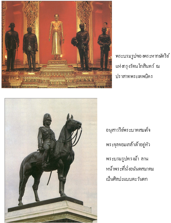 งานประติมากรรมที่เป็นศิลปะตะวันตกหรือศิลปะสากล ได้แก่ รูปปั้นพระบรมรูปของพระมหากษัตริย์ไทยในสมัยรัตนโกสินทร์ภายในปราสาทพระเทพบิดร วัดพระศรีรัตนศาสดาราม กรุงเทพมหานคร อนุสาวรีย์พระบาทสมเด็จพระจุลจอมเกล้าเจ้าอยู่หัว พระบรมรูปทรงม้า ขนาดสองเท่าของคนจริงปั้นและหล่อในประเทศฝรั่งเศส ประดิษฐาน ณ ลานหน้าพระที่นั่งอนันตสมาคม เมื่อปี 2450 เป็นต้น