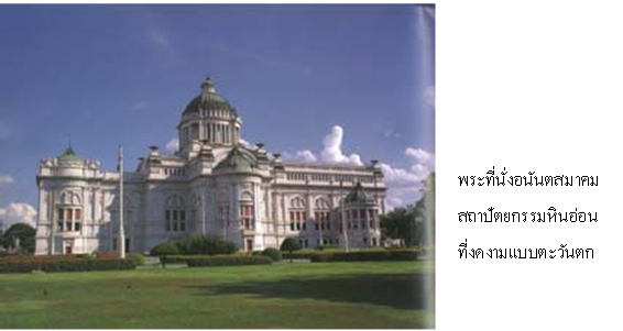 งานสถาปัตยกรรม ศิลปะที่ได้รับอิทธิพลจากศิลปะตะวันตก เช่น พระที่นั่งจักรีมหาปราสาท พระที่นั่งพุทไธสวรรย์ ในพระบรมมหาราชวัง พระที่นั่งอนันตสมาคม กรุงเทพมหานคร และพระนครคีรี พระราชวังบนเขามหาสวรรค์ จังหวัดเพชรบุรี เป็นต้น