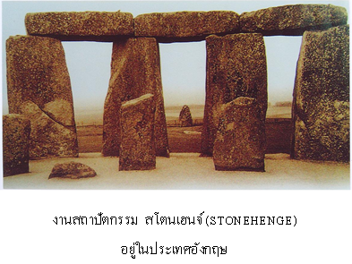 สถาปัตยกรรม งานสถาปัตยกรรมในยุคนี้เป็นงานแสดงโครงสร้างทางสถาปัตยกรรม แบบวางพาดระบบเสาและคานที่เรียกว่าสโตนเฮนจ์ (STONEHENGE)