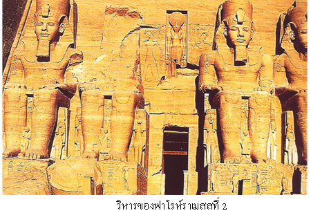 2. วิหาร วิหารหรือเทวสถานเป็นที่ประดิษฐานเทวรูป หรือเป็นที่สิ่งสถิตย์ของเทพเจ้า สร้างด้วยหินมีขนาดใหญ่โตมาก มองจากด้านหน้าของวิหารจะเห็นหอสูงคล้ายปราการที่แข็งแรง เรียกว่าพิโลน ทำเป็นชั้นลดหลั่นกันไป คล้ายอาคาร ที่ติดต่อกัน ชั้นสูงอยู่หน้า ชั้นต่ำอยู่หลัง ภายในวิหารแบ่งเป็นห้อง ๆ ใช้เป็นที่ประชุมบูชาเทพเจ้า ภายในวิหารเรียงรายด้วยเสาต้นใหญ่ ๆ ซึ่งเป็นเครื่องค้ำยันส่วนบนให้มีความแข็งแรง คงทน ถาวร วิหารที่มีชื่อเสียงคือ วิหารคาร์นัค (KARNAK) วิหารเอ็ดฟู (EDFU) และวิหารลักซอร์ (LUXOR) วิหารของฟาโรห์ราเมเสสที่ 2