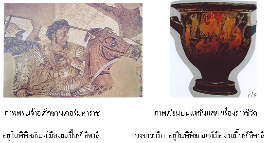 ศิลปะอัสซิเรียน ประมาณ 900 ปี ก่อนคริสตศักราช 2.3 ศิลปะกรีก (GREEK ART) จิตรกรรม ศิลปกรรมของกรีก ประเภทงานจิตกรรมเป็นภาพลวดลายและภาพคนประดับตกแต่งแจกันและภาชนะเครื่องปั้นดินเผา การประดับหินสี MOSAIC) เป็นภาพพระเจ้าอเล็กซานเดอร์มหาราช