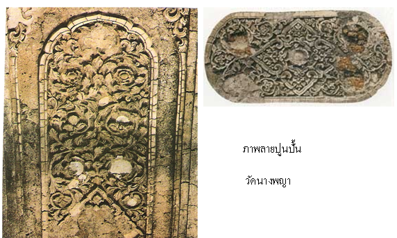 นอกจากนี้ ภาพปั้นสลักแบบสุโขทัยแท้ ยังปรากฏให้เป็นหลักฐาน เช่น ภาพลวดลายปูนปั้นผนังโบสถ์วัดนางพญา ภาพเทพนมและภาพลวดลายสลักไม้ ประกอบเพดานพระปรางค์วัดพระศรีมหาธาตุ เป็นต้น