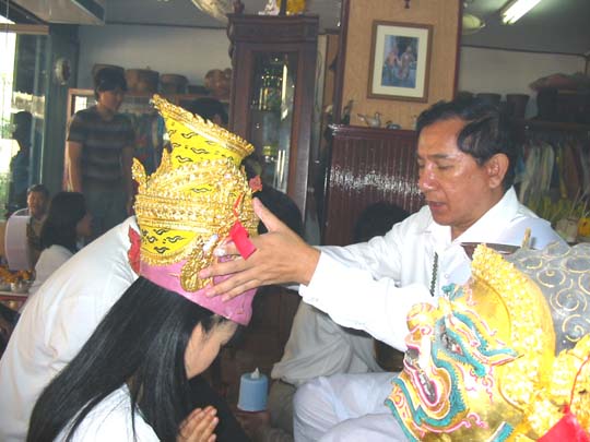 ประธานในงาน เชิญเข้ามาจุดเทียนทอง (ด้านขวา) เทียน (ด้านซ้าย) และเทียนชัยที่ตั้งอยู่ตรงกลางระหว่างเทียนทอง – เงิน จุดธูปบูชา ๙ ดอกแล้วเชิญกลับไปที่พักในที่สมควร