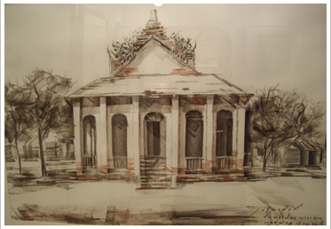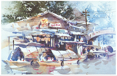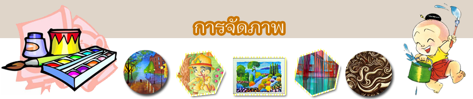 ภาพบ้านแพ้ว เทคนิค สีนํ้า ผลงานของ สุชาติ วงษ์ทอง แสดงการจัดภาพให้เป็นเอกภาพโดยการจัดเรือ และ บ้านเรือนให้รวมกลุ่มทับซ้อนเกี่ยวพันเป็นอันหนึ่งอันเดียวกัน
