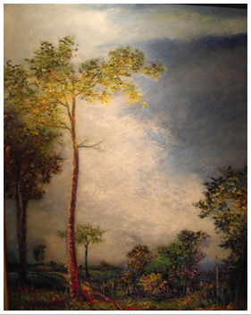 ภาพทิวทัศน์บกแสดงการจัดภาพสมดุลแบบซ้าย-ขวาไม่เหมือนกัน แต่ใช้ นํ้าหนักสีของท้องฟ้าช่วยถ่วงดุล กับรูปต้นไม้ให้ดูแล้วรู้สึกว่าภาพมีความสมดุล