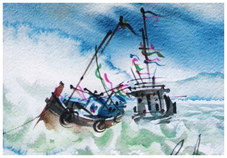 ภาพเรือโต้คลื่น เทคนิคสีนํ้าผลงานของ สุชาติ วงษ์ทอง แสดงจุดสนใจของภาพด้วยเรือ