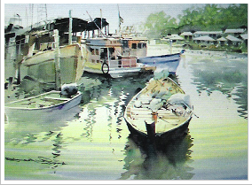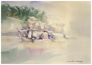 แสดงความงามของภาพสะท้อนให้เห็นชีวิตที่เรียบ ง่ายของชาวเรือที่หากินอยู่กับน้ำด้วยวิธีการใช้สีน้ำลักษณะเปียกชุ่ม