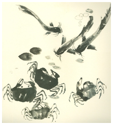 ภาพเขียนเทคนิคหมึกจีนบนกระดาษ แสดงน้ำหนักอ่อนจางในบางส่วนด้วย การผสมน้ำลงในหมึกเล็กน้อย