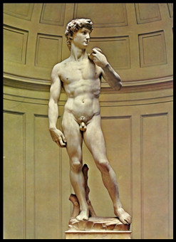 “ดาวิด” (DAVID) ผลงานของไมเคิลแอนเจโล (MICHELANGELO BOUNARROIT) เทคนิค แกะสลักหินอ่อน ปัจจุบันอยู่ที่ แกลเลเรีย เดลอคาเดเมีย,ฟลอ เรนซ์,อิตาลี