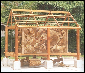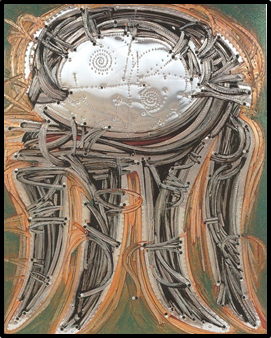 ผลงานของทิพเนตร์ แย้มมณีชัย เทคนิค สื่อผสม (ประกอบไม้ ไม้ไผ่ ขี้ควาย ดิน เยื่อกระดาษ) |
