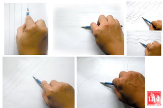 1. ลากเส้นตรงโดยจับดินสอแบบคว่ำใช้ทุกนิ้วสัมผัสให้ใช้ข้อศอกเป็นศูนย์กลางโดยลีอคข้อมือไว้จะได้เส้นที่ตรง