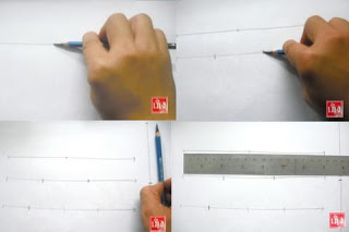 3. ลากเส้นแนวนอน โดยจับให้ดินสอแบบคว่ำใช้ทุกนิ้วสัมผัส โดยให้ขนานไปแนวเดียวกับเส้นจะได้เส้นที่ตรง เพราะดินสอได้ถูกประคองไว้ไม่ให้กระดุกกระดิกด้วยนิ้วทั้งห้าของเราแล้ว