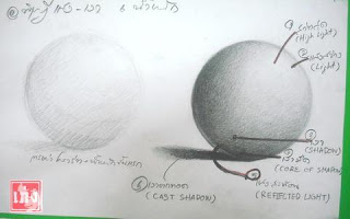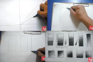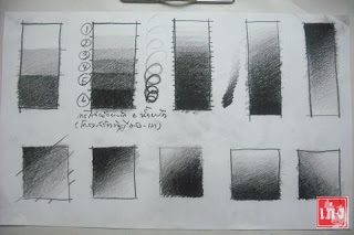 ใช้ดินสอ EE ตีกรอบ เพื่อฝึกการไล่น้ำหนัก 6 น้ำหนักจากนั้นก็แบ่งครึ่งในช่องน้ำหนักทั้ง 6 ไปเรื่อยๆจนสามารถกระจายน้ำหนักได้ละเอียดขึ้นเรื่อยๆการลงน้ำหนักนี้ก็ เพื่อที่ว่าเราจะสามารถทำให้เกิด ความลึก ระยะ หรือมิติ เพราะตัวน้ำหนักนี้เอง สามารถทำให้เกิดภาพ 2 มิติ หรือ 3 มิติได้ ถ้าเราไม่รู้จักน้ำหนัก หรือไม่สามารถควบคุมน้ำหนักมือของเราได้ก็จะสามารถมิติพิศวงให้กับผู้ชมงานรวมทั่งตัวเราเองได้เหมือนกัน