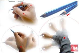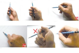 ได้โปรด กรุณาอย่าใช้นิ้วใดนิ้วหนึ่งล๊อกดินสอ พยายามจับให้ดินสอเป็นอิสระมากที่สุดโดยนิ้วแค่เป็นตัว ประคองดินสอไว้ให้เหมือนกับว่าดินสอนั้นเป็นส่วนหนึ่งในมือของเราที่จะ บังคับให้ปลายดินสอนั้นไปทางไหนก็ได้ตามใจปรารถนาเหมือนกับเวลาใช้นิ้วก้อย แคะขี้มูก