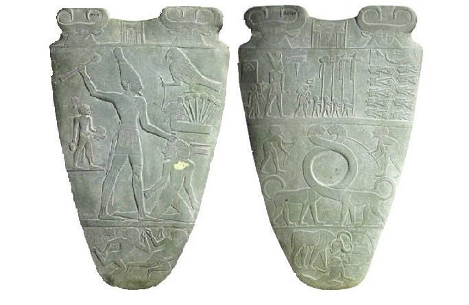 สูง 25 นิ้ว พบที่เมืองเฮียราคอนโปลิส (Hierakonpolis) สลักภาพนูนต่ำ ด้านหนึ่งแสดงภาพพระเจ้านาร์เมอร์สวมมงกุฎฟาโรห์ของอียิปต์บนหรือมงกุฎขาว (white crown) กำลังลงอาญาศัตรู ตรงหน้าของพระองค์มีรูปเหยี่ยวซึ่งเป็นสัญลักษณ์ของเทพฮอรัส ผู้พิทักษ์ท้องฟ้าและผู้ปกป้องกษัตริย์ ใต้รูปเหยี่ยวเป็นรูปต้นปาปิรัสบนเรือรูปสฟิงซ์ อันเป็นสัญลักษณ์ของอียิปต์ล่าง ใต้ฝ่าพระบาทมีรูปศัตรูสองคนกำลังหนี ภาพบุคคลมีลักษณะเห็นด้านข้าง ไหล่กว้าง สะโพกแคบ ซึ่งเป็นแบบที่จะได้รับการทำสืบต่อไปในจิตรกรรมและประติมากรรมของอียิปต์อีกเป็นระยะเวลายาวนาน