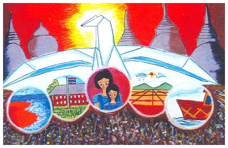 ผลงานของเด็กหญิงจันทิมา พิมพ์สิงห์ แสดงการระลึกถึงความประทับใจ วันรัฐบาลนำนกกระดาษมาโปรยเป็นสื่อให้สร้างสันติ การจัดภาพแสดงให้เห็นเนื้อหาหลายเหตุการณ์